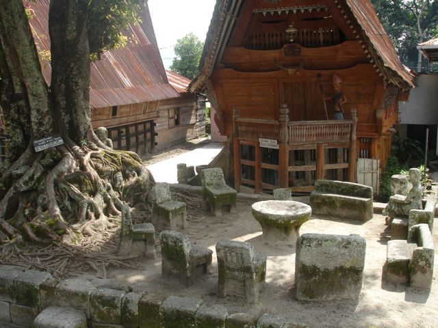 I rent a bright red automatic scooter, and set out to explore. My first stop is in Ambarita where the roadside market is brimming with hand woven blankets, miniature carvings of batak houses and hand tooled leather craft. On a hill behind the market a megalithic site set in a dark grove provides a silent testament to the island’s cannibalistic past. The circle of 300-year-old stone chairs was once the conference area for Batak kings and a place for passing judgement on a criminal or enemy prisoner. At an adjacent site, the accused would be bound, and rubbed with chilli and garlic and then beheaded with a long knife. A local man shows me around and points out thespecial curved stone where the beheadings took place. He explains that the head would be thrown into the lake and the body cut into small pieces that were mixed with buffalo meat and boiled into a stew. “Fortunately,” he says, “we are now Christians and do not eat men any longer.”
