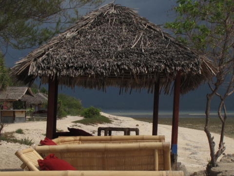 The view is also pretty good from a lounging position and I often find myself sinking into the cushions in a beach-front beruga with a thick sticky Lombok coffee. Monsoon season is a magical time when the heavy, dark clouds looming over Lombok create a moody back drop. Nature is broody here and unleashes dazzling electrical storms which whip the sea up in a frenzy of whirl pools and crazy currents. But the storms blow out as quickly as they blow and calm is soon restored. It is also a great place for people watching: Colourful outriggers from Lombok bring locals with sacks of produce to sell in the market; Fast boats from Bali disgorge backpacker-laden tourists searching for cheap digs; Beach-sellers ply their pearls, watches and silver; Local women glide by with baskets of bananas or fresh fish balanced on their heads; Children play in the shallows and giggle; Muslim women pass by covered in head scarves, long shirts and trousers; Western girls pass by – barely covered at all. Goats and chickens trot along the road and there are cats everywhere, mostly with deformed tails or no tail at all. It’s a genetic defect, but the islanders love to invent stories and will tell you that cat tail soup is a local delicacy.